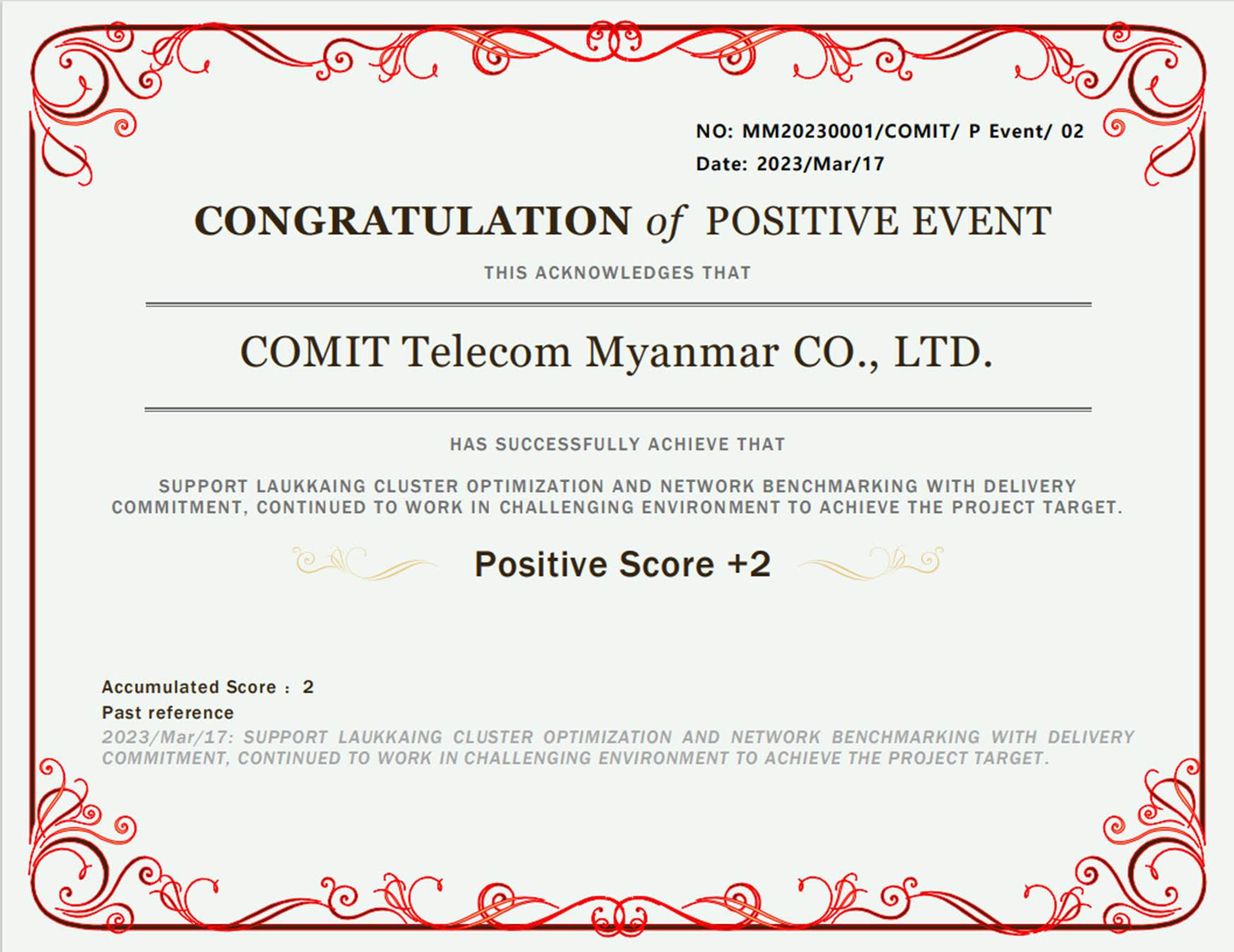 Recently, COMIT was honored to receive the Positive Event Of CDC Manage Service Project award from partner Huawei Myanmar after successfully implementing the Project of Optimization and Network Benchmarking in Laukkaing, Myanmar.