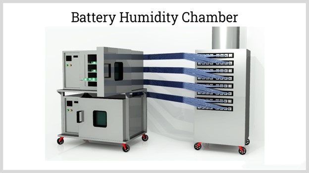 Humidity chambers for batteries have special fixtures that allow the testing of over 50 batteries during one testing cycle. By being able to test multiple configurations of batteries in a single test cycle, researchers can gather a wide range of data regarding each of the different design.