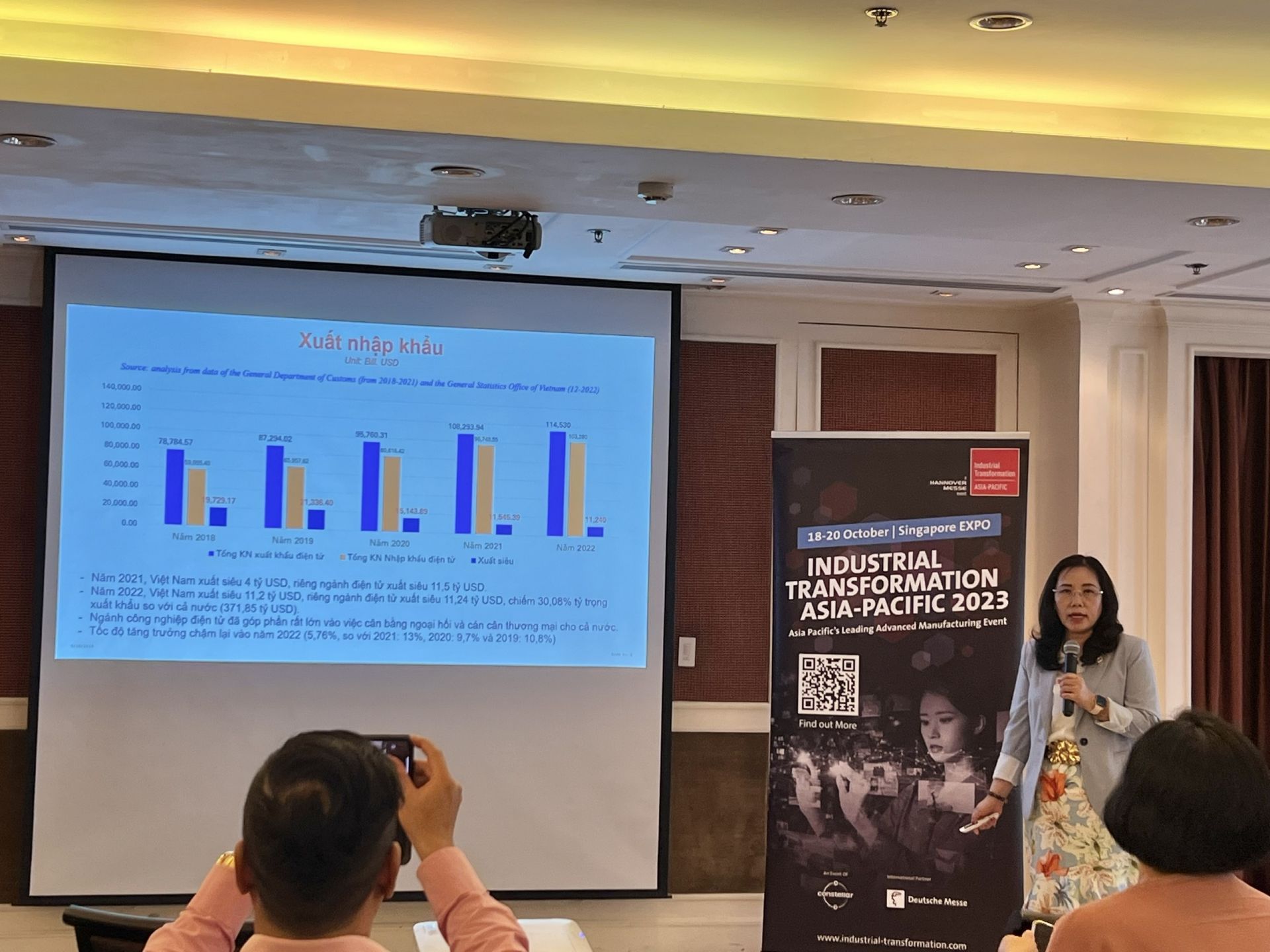 These are the comments emphasized by Ms. Do Thi Thuy Huong, Executive Director Board of Vietnam Electronic Industries Association (VEIA), Vice President of the Vietnam Association of Supporting Industries (VASI) at the Industry 4.0 networking conference. The conference was organized by the Vietnam Electronic Industries Association (VEIA) and the Organizing Committee of Singapore ITAP 2023 on May 10.