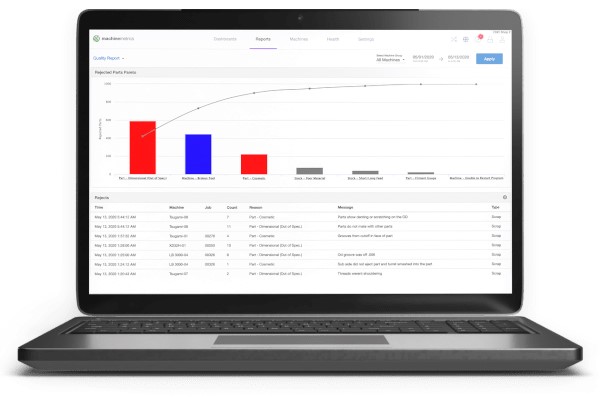 Các danh mục phổ biến của thời gian dừng bao gồm : thay đổi công cụ quá mức, chuyển đổi công việc quá nhiều, thiếu người vận hành và bảo trì máy không có kế hoạch. Với MachineMetrics, bạn không chỉ có cái nhìn chính xác về thời gian ngừng hoạt động mà còn có thể xác định được vấn đề của mình nằm ở đâu.