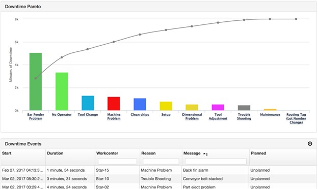Một trong những báo cáo hữu ích nhất để hiểu lý do thời gian ngừng hoạt động là Downtime Pareto, sẽ tổng hợp tất cả các lý do thời gian ngừng hoạt động được ghi lại.