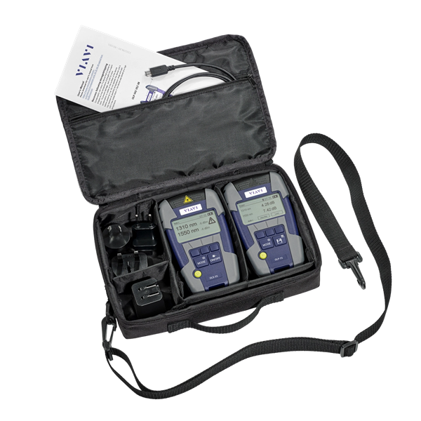 The VIAVI OMK-3xV2 optical test kits are a range of pocket-sized and rugged instruments for installing and maintaining single mode (SM) and multimode (MM) fiber optic networks. All test kits are equipped with an optical power meter and a dual or quad-wavelength optical light source for power level, insertion loss measurements, and continuity checks.